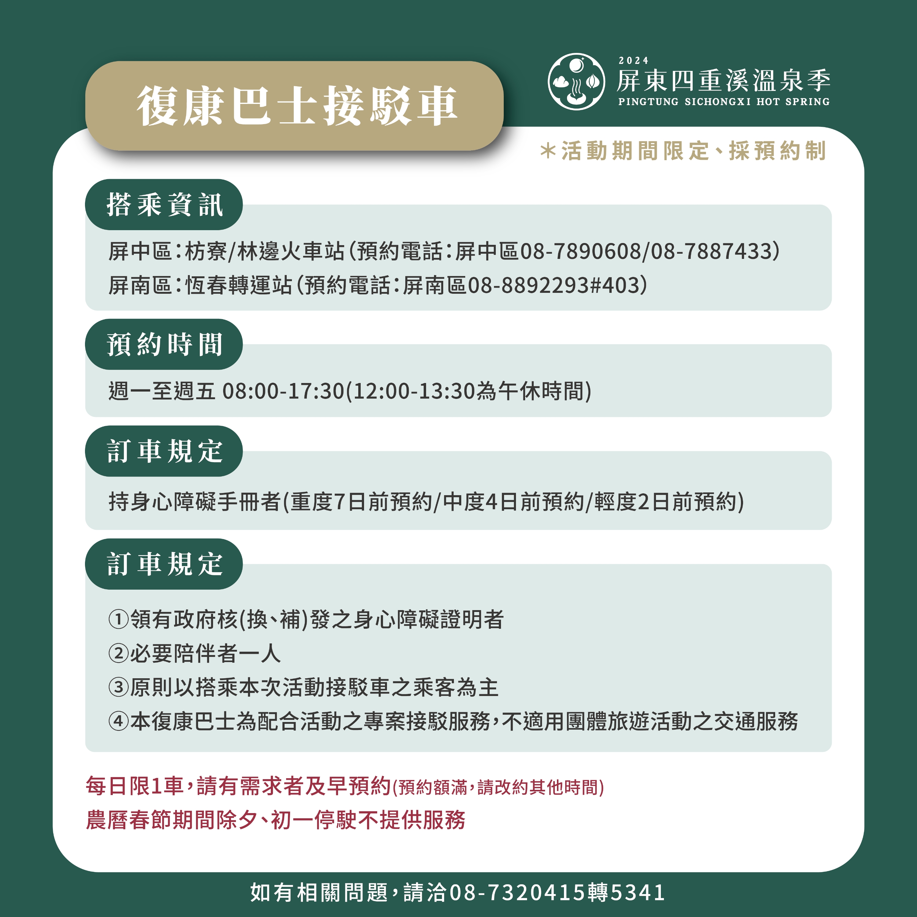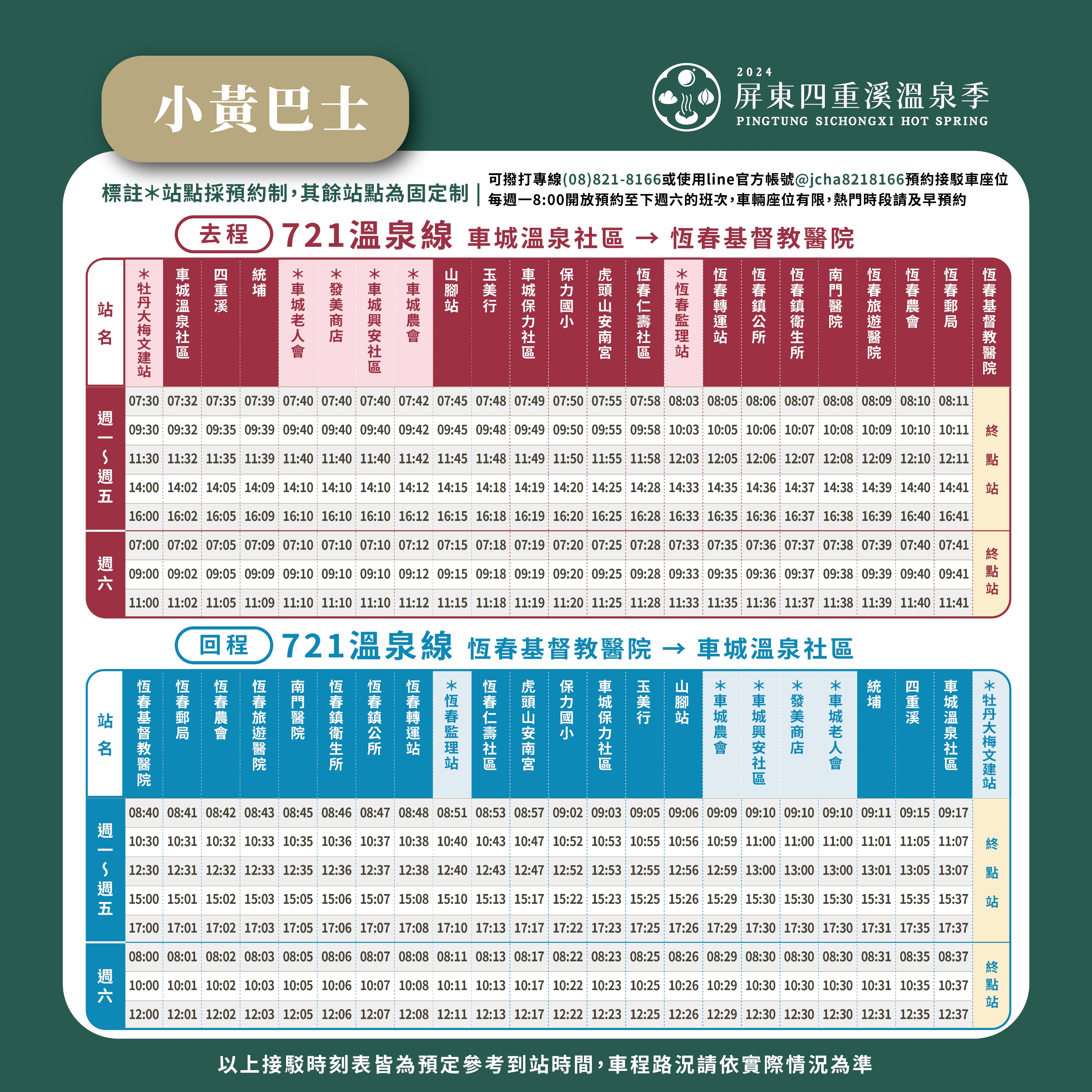 公車及溫泉季接駁車諮詢專線:08-7221288、0937-680359、0925323229