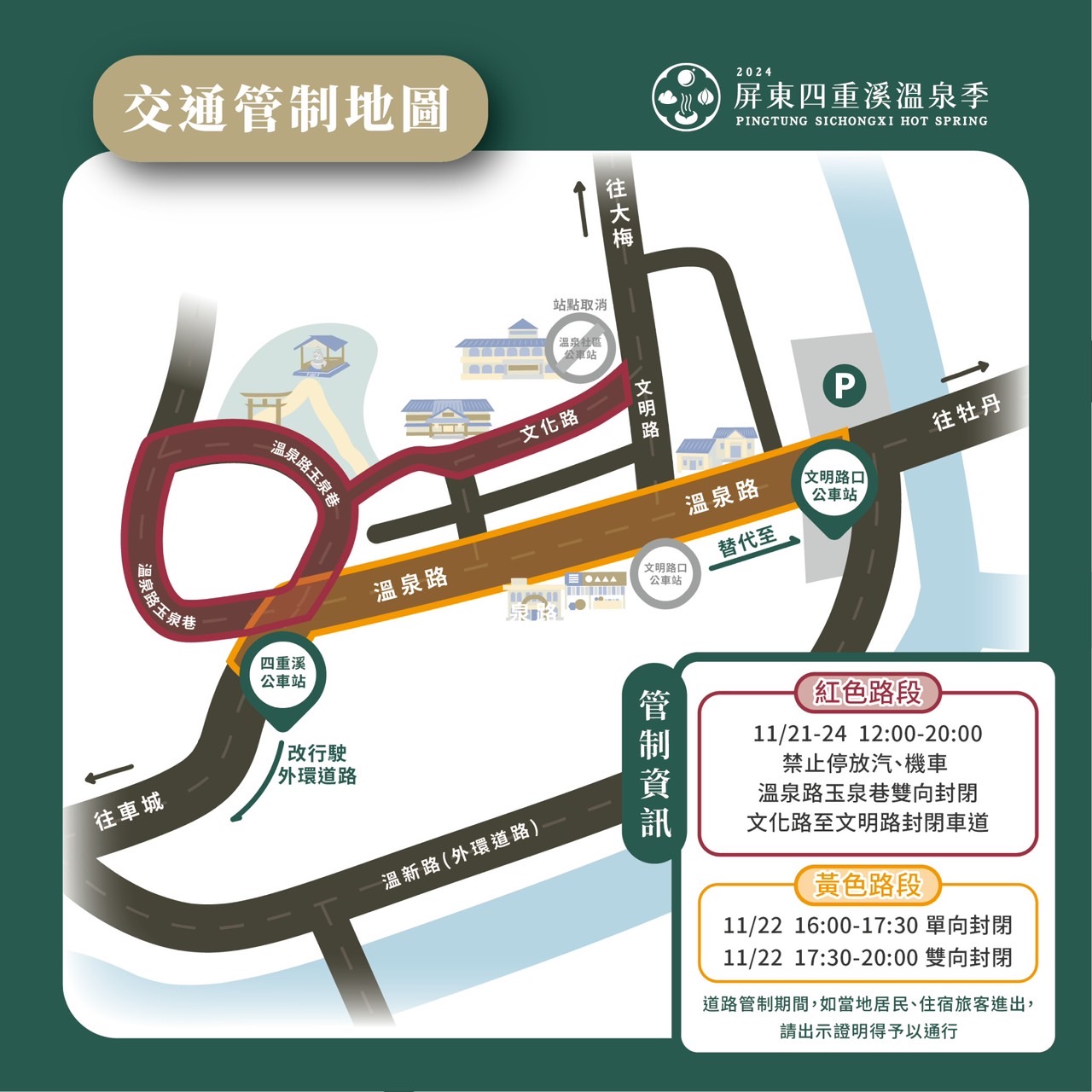 11/22 16:00-20:00溫泉路將全面封街,請各位提前於外環道路前往四重溪溫泉區停車場停放車輛