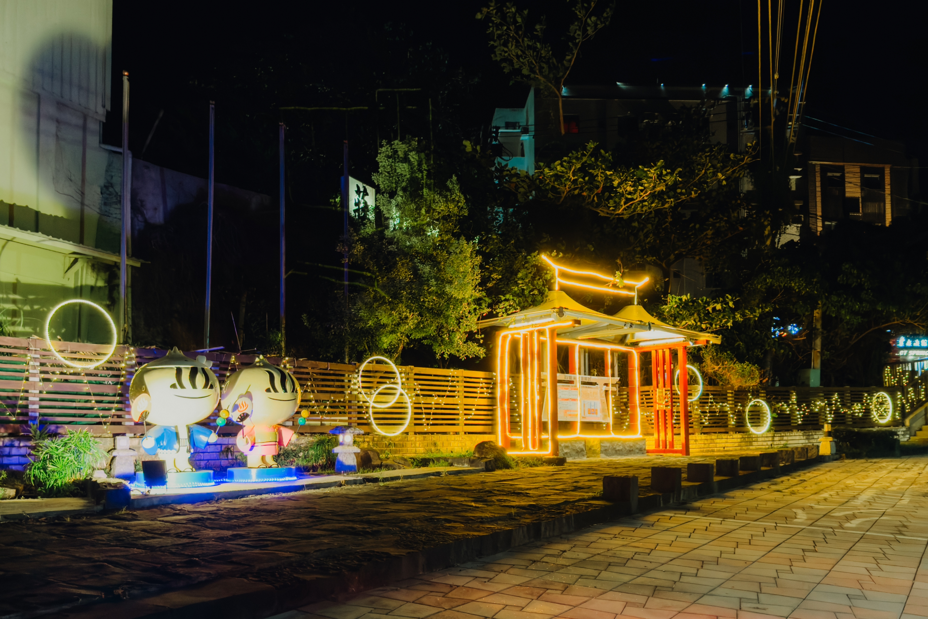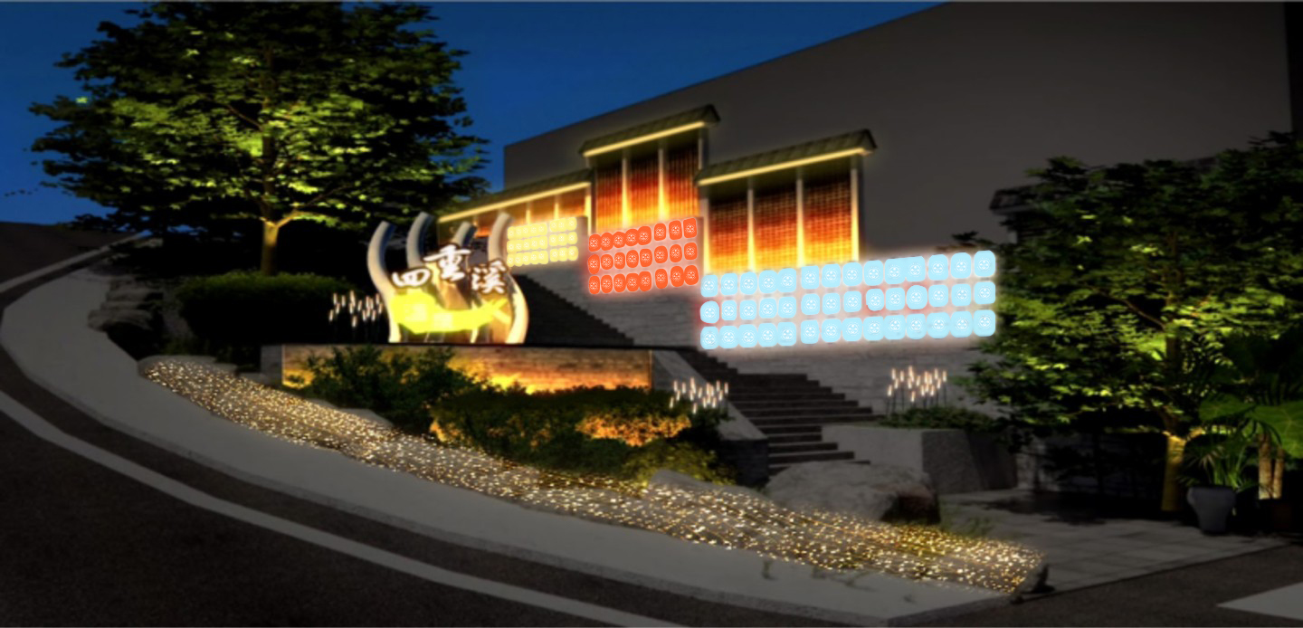 入口轉角意象,以街景物件照明的手法將四重溪的溫泉轉化意象點亮呈現。也成為四重溪重要的一個街角意象,作為印象的亮點。
